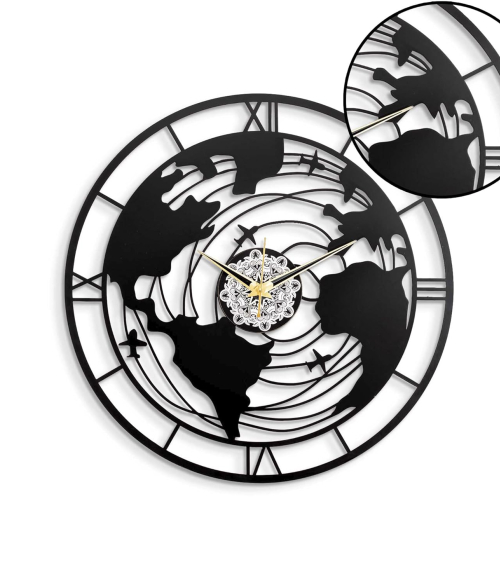 METSY Metal Wall Clock World Map Design | Metal Wall Art Clock Decor for Living Room | Wall Hangings for Home Decoration | Size: 44.5x44.5 cm | Laser Cutting & Black Powder Coated