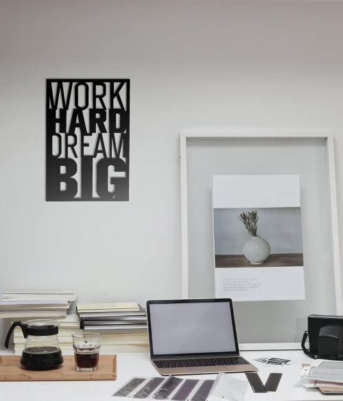 This is a motivational wall art that will be a great addition to your living area. It features one of the most popular quotes, "Work hard dream big" in black matte finish on metal material. This inspirational quote will motivate you to work hard and stay focused on your dreams no matter how big they are!