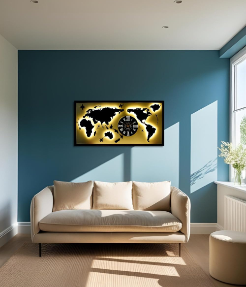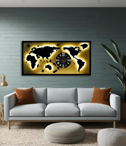 Introducing the perfect way to add a touch of wanderlust to your home décor. This wall art features a beautiful world map, with each country lit up in soft LED light. Whether you prefer an on-the-go lifestyle or just love dreaming of faraway places, this art is sure to inspire you. World Clock Map for Wall and White & Golden clocks