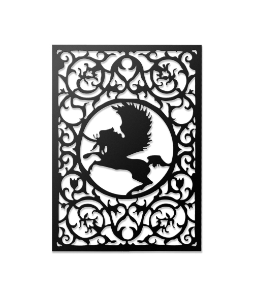 Winged horse pegasus, a metal wall art for your living area with matte finish in black color. It has an elegant design that will make you want to have it in your home or office. This product is perfect for people who are looking for something unique and different from the usual designs of metal wall art. Ideal for the horse lover who wants to bring their love of animals into their room.